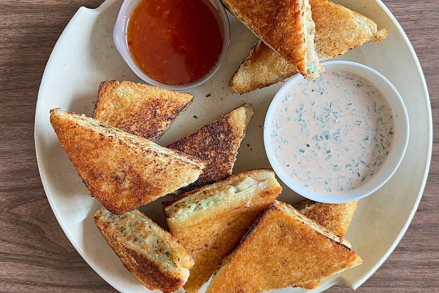 Цей рецепт від шеф-кухаря Рона Хсу пропонує спрощений спосіб насолодитися класичними китайськими тостами з креветками в домашніх умовах, минаючи традиційну обсмажування у фритюрі. Замість звичайного відкритого, обсмаженого у фритюрі методу, підхід Хсу використовує хліб для сендвічів, щоб укласти креветкову начинку, а потім підсмажує його на сковороді до золотистої та хрусткої скоринки.