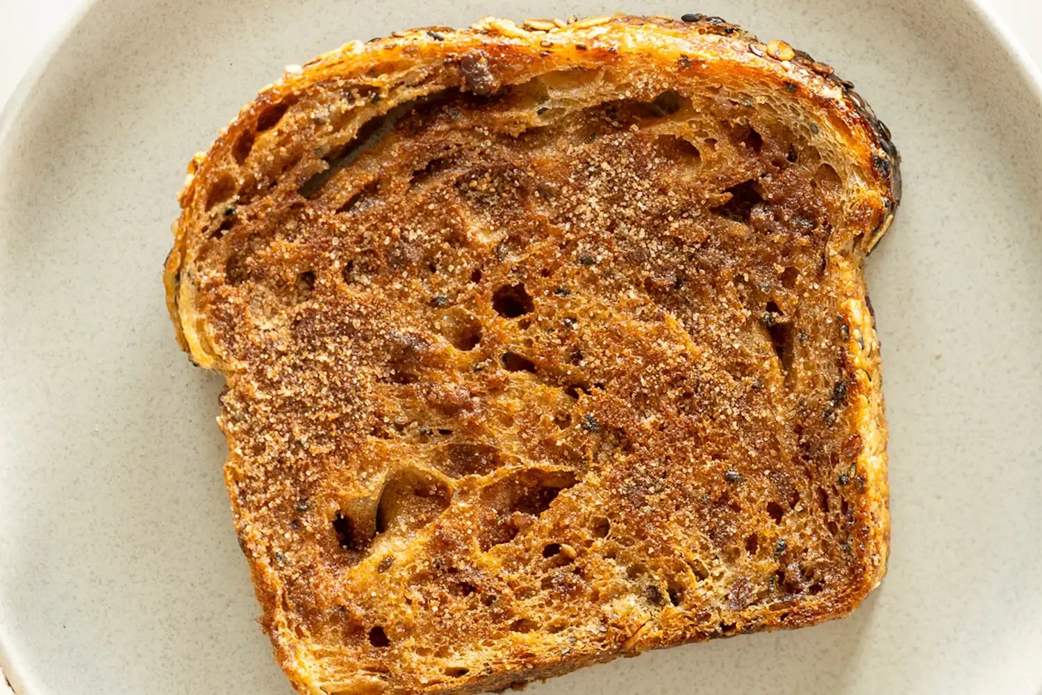 3. Карамелізація : Додайте ще олії, переверніть хліб і посипте його сумішшю цукру з корицею. Готуйте ще хвилину-дві, поки нижня сторона не стане золотистою, а цукор не карамелізується.