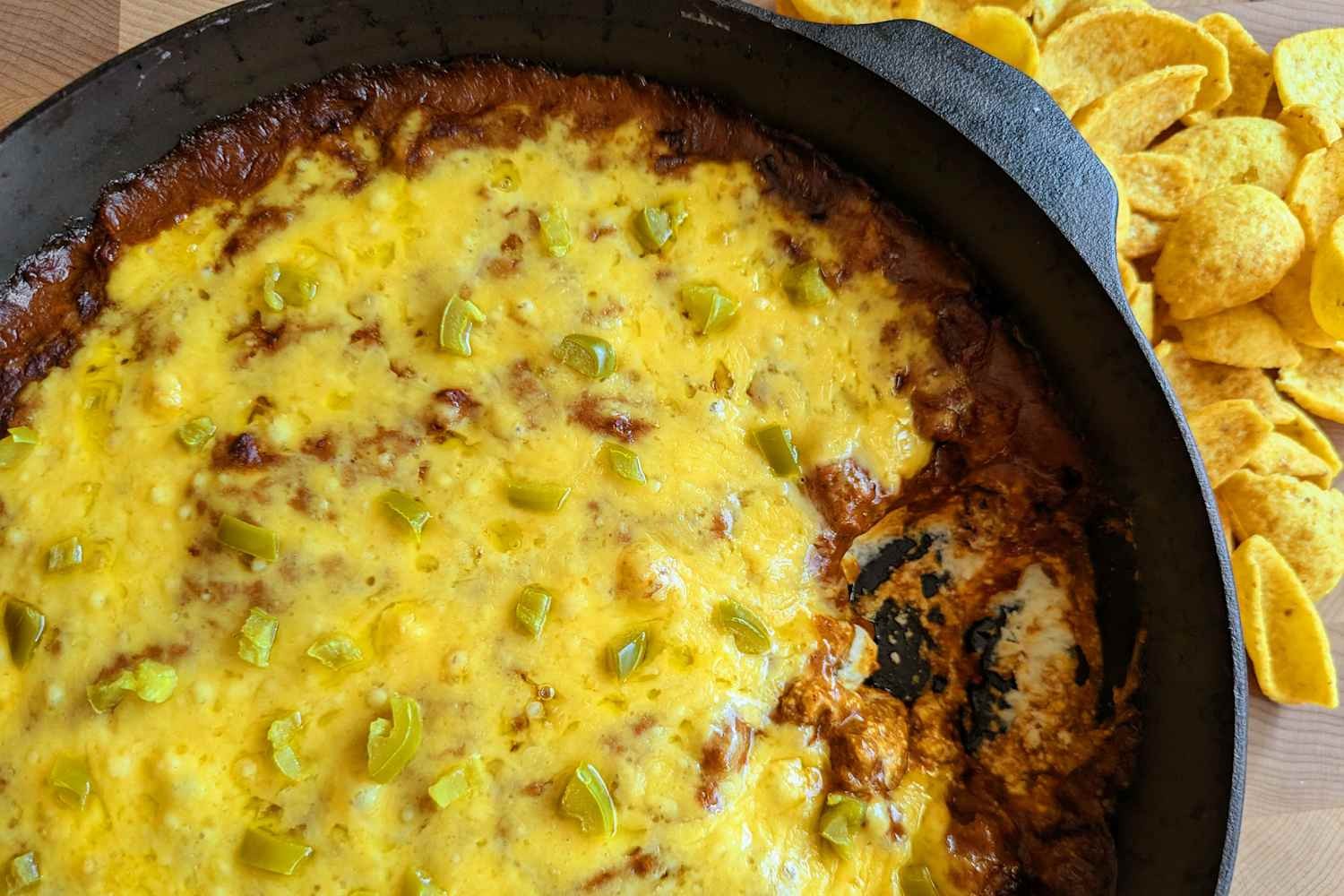 L’idée principale est la superposition : du fromage à la crème comme base, du chili comme corps et du cheddar comme couronne dorée et pétillante.
