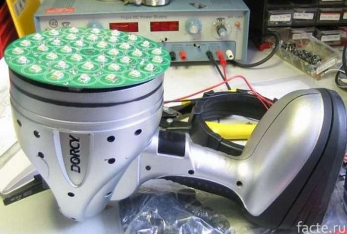 По суті це був ліхтарик з потужним стробоскопом на базі світлодіодів. Інтенсивний світловий потік викликає напади запаморочення і блювотних позивів. Цей «пістолет» збиралися застосовувати правоохоронці для боротьби з демонстраціями. В США відмовилися від цього проекту, так як результативність впливу не перевищувала 30%. Однак два винахідника відтворили «блювотний пістолет» і торгують через інтернет за $250.