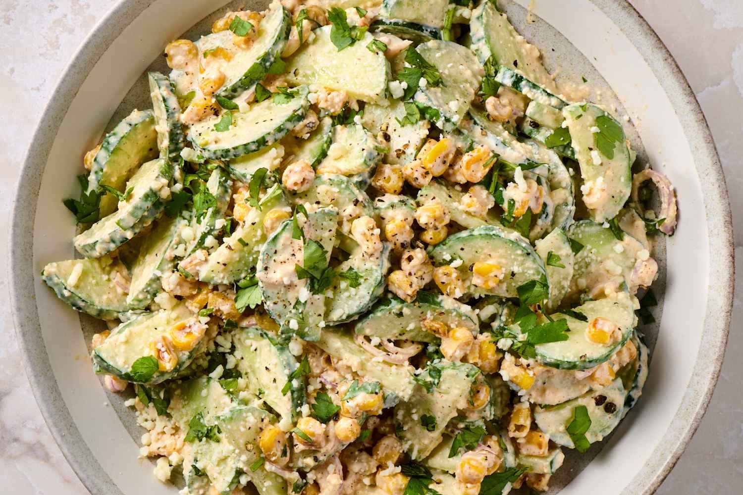 Łącząc właściwości chłodzące ogórka z wędzonymi i kremowymi elementami meksykańskiej kukurydzy, ta 15-minutowa sałatka stanowi pyszne i łatwe rozwiązanie na sezonowe uroczystości. Służy jako idealny pomost pomiędzy lekką sałatką a pożywnym dodatkiem.