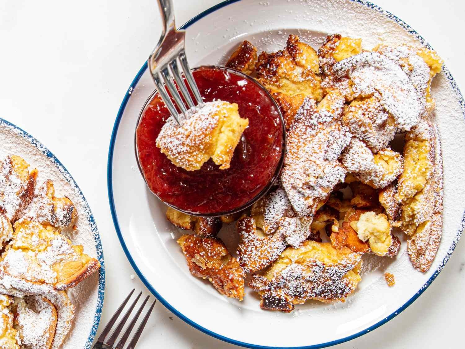Кайзершмаррн — это воздушный, рваный блин, который обычно подают с сахарной пудрой и сливовым джемом. Название переводится как «Императорский беспорядок», отсылка к его императорскому происхождению (предположительно любимый императором Францем Иосифом I) и намеренно небрежному приготовлению. Секрет его текстуры — взбитые яичные белки, которые создают похожие на облака кусочки, карамелизирующиеся на сливочном масле, иногда с изюмом, вымоченным в роме.